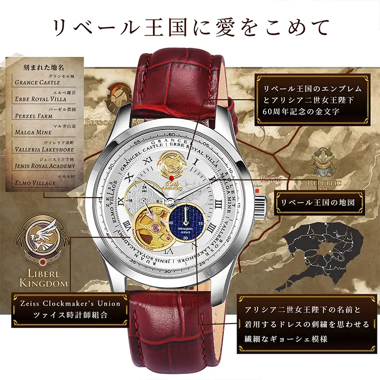 文字盤の中央にはリベール王国の地図を配置し、周囲にはエステルとヨシュアが巡ったグランセル、ロレント、ボース、ルーアン、ツァイスの地名を刻印しました。裏蓋はバックスケルトン仕様となっており、日本製ムーブメントが刻む精緻な動きをご覧いただけます。