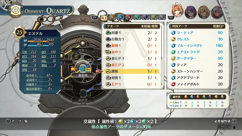 メインキャラクターたちが持つ「戦術オーブメント」にクオーツと呼ばれる結晶回路を組み込むことで、キャラクターの能力を強化したり、さまざまな導力魔法(アーツ)が使えるようになります。